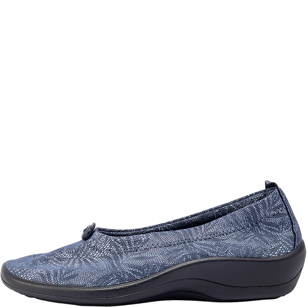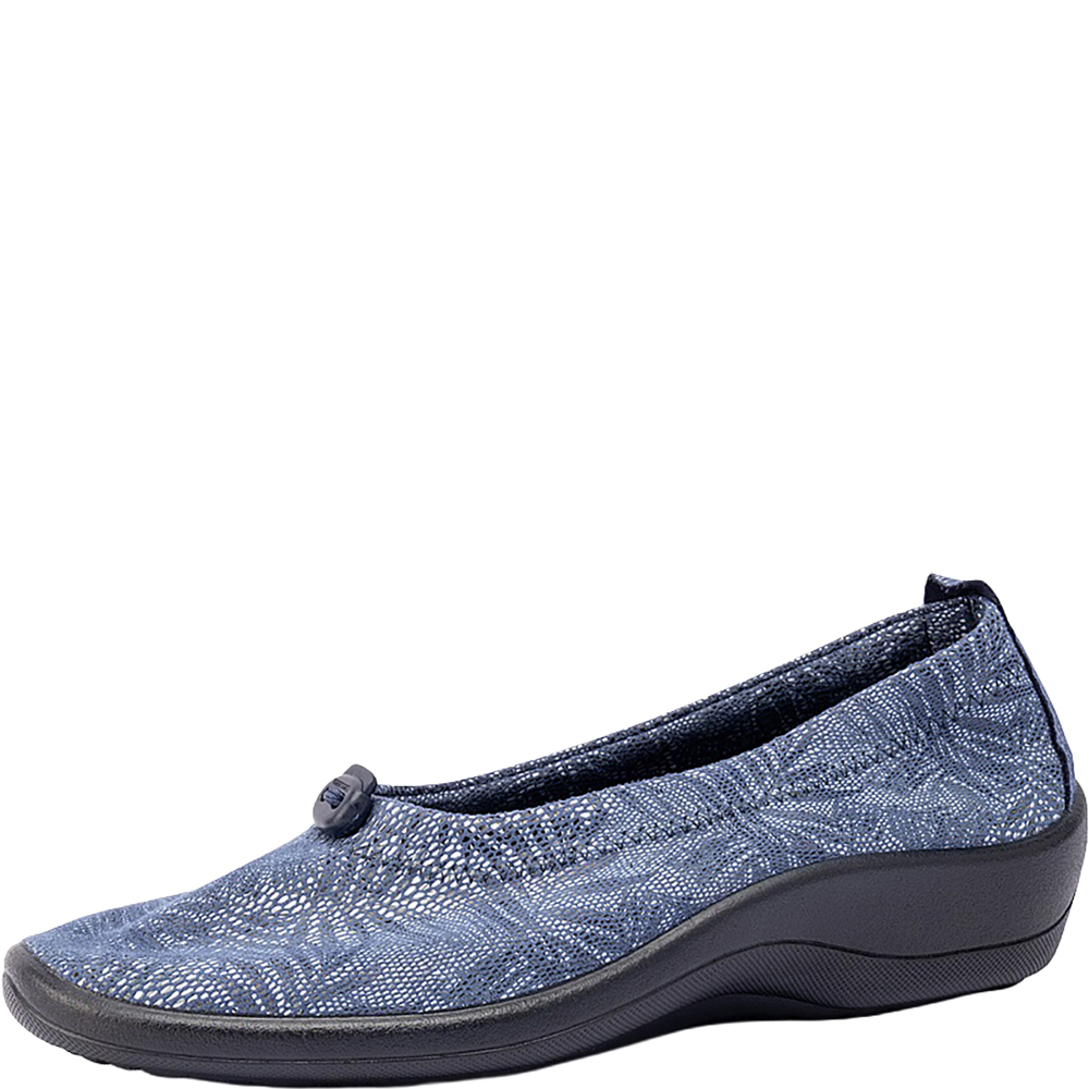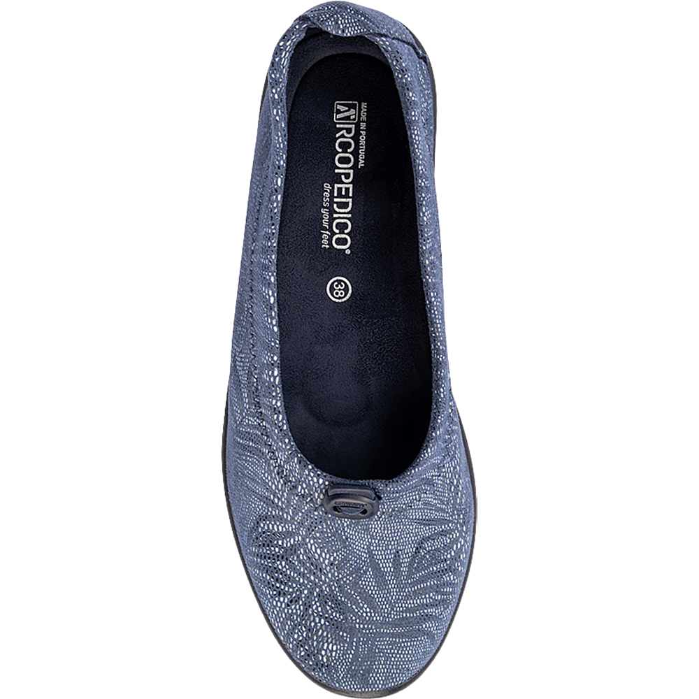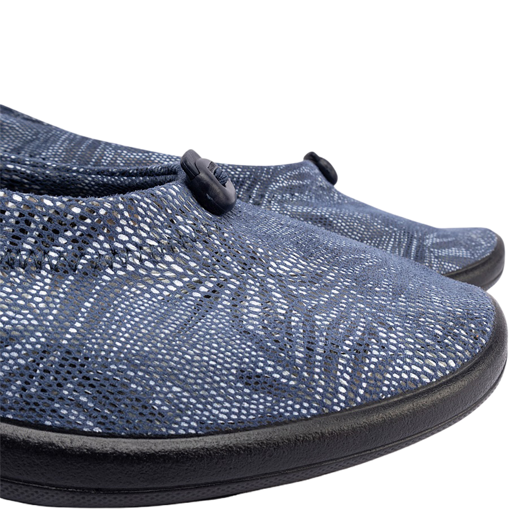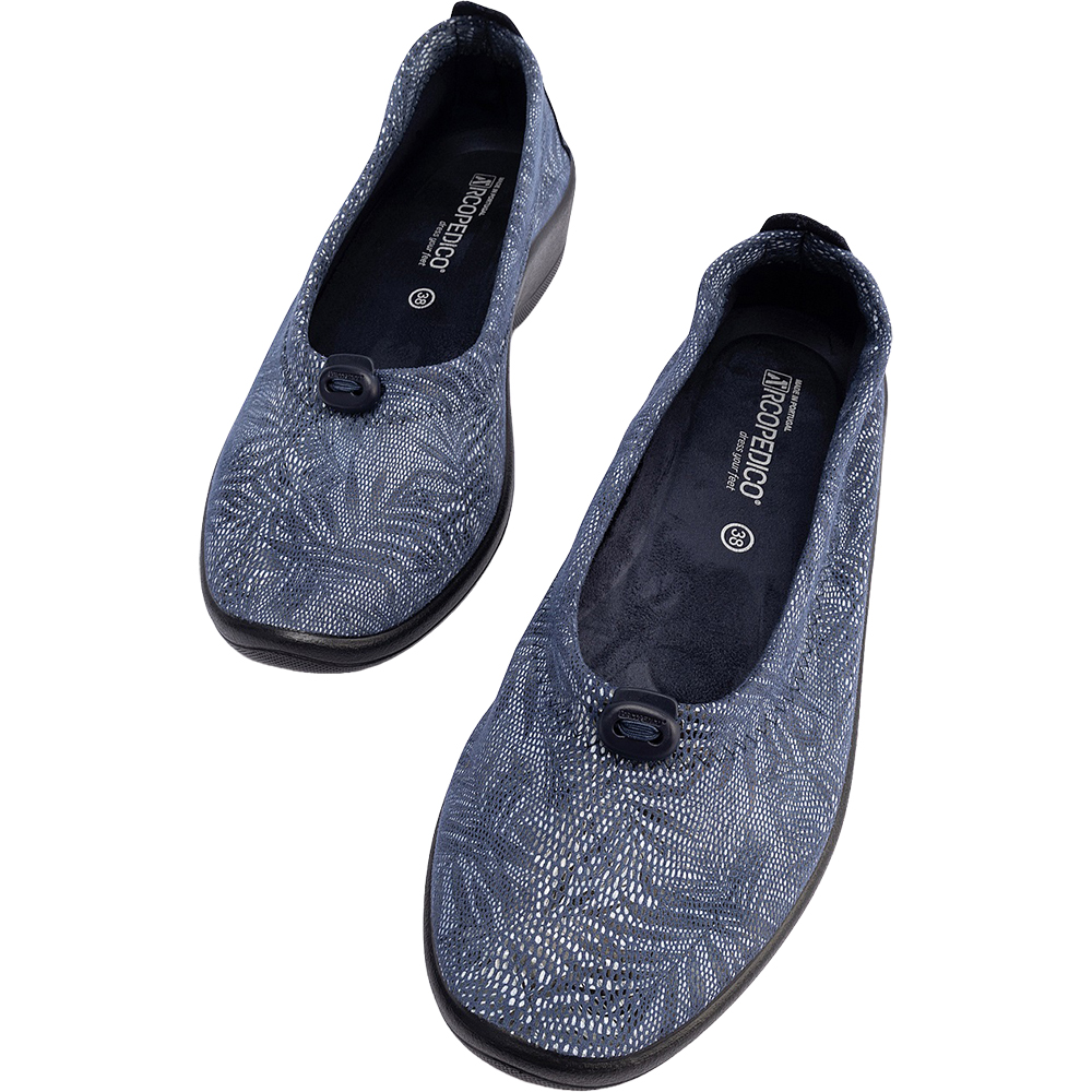 Arcopedico Cabrera Palm Navy Ballet Flats are the quintessential ultra lightweight, ultra comfortable and supportive ballet flat. Designed for everyday wear and for those with sore feet (bunions and hammertoes in particular!), the vegan Cabrera flat shoes feature a signature Twin Arch Support System, Hybrid-Air Insole System, and New Lytech Techno Elastic Uppers – all made from 100% sustainable recycled or recyclable materials. The outsole is antiviral, shock absorbing, and the upper can be adjusted if required – if you have a slimmer or more shallow foot, you can tighten the elasticated topline using the toggle. Made in Portugal.
