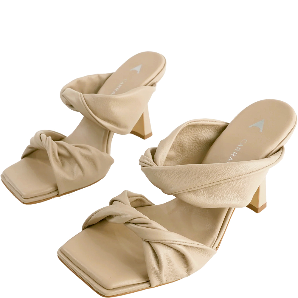 Carrano Bella Nude Slides 513019 are so wearable. The “twisted” forefoot and instep bands hold you in place, there’s abundant padding underfoot and they are well pitched on a flared block heel. Modern with a squared off toe, these “high” heel sandals don’t feel that high and work with everything. Handcrafted in Brazil.