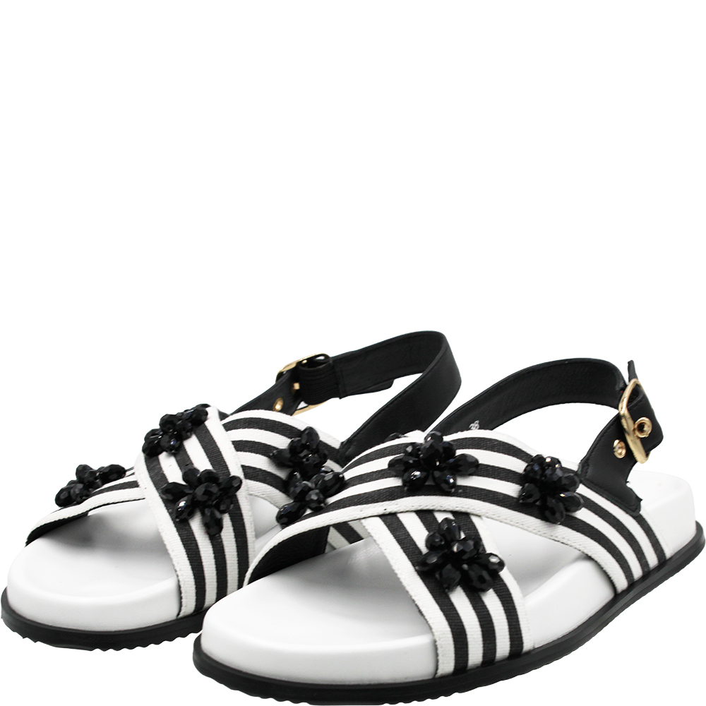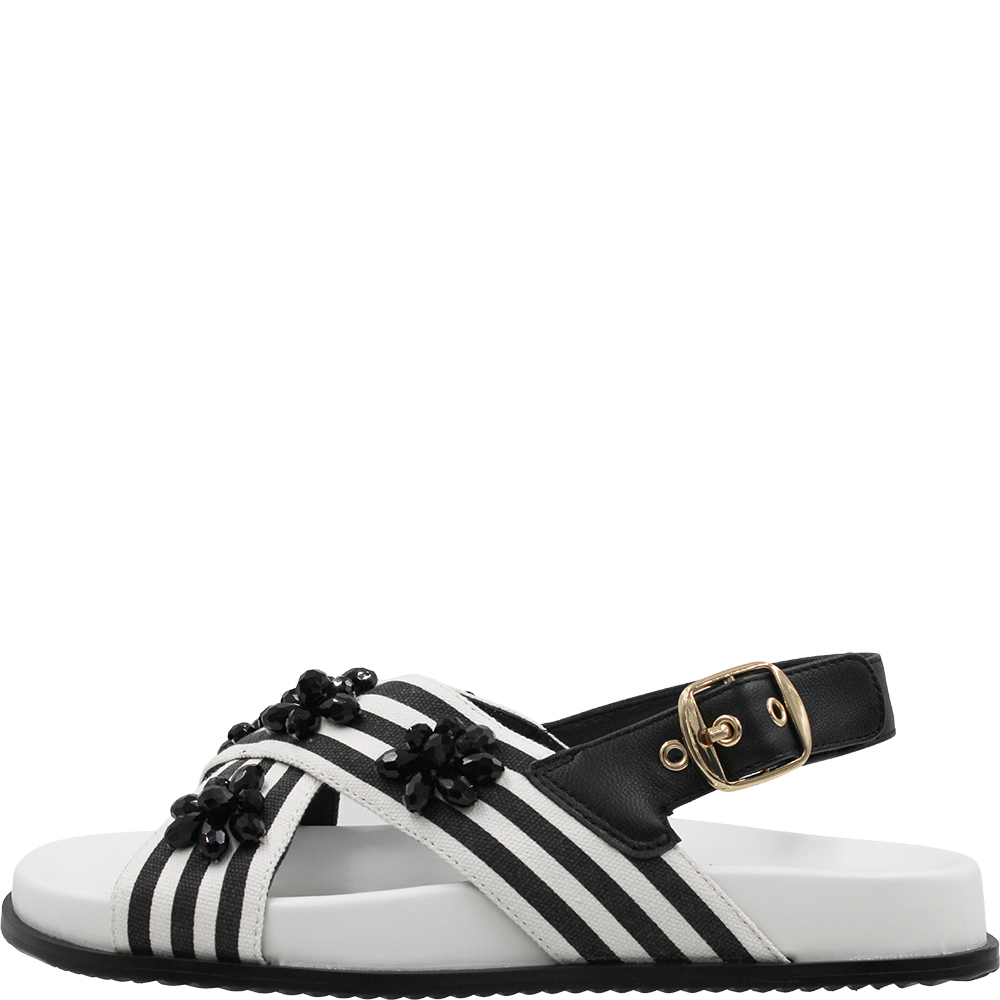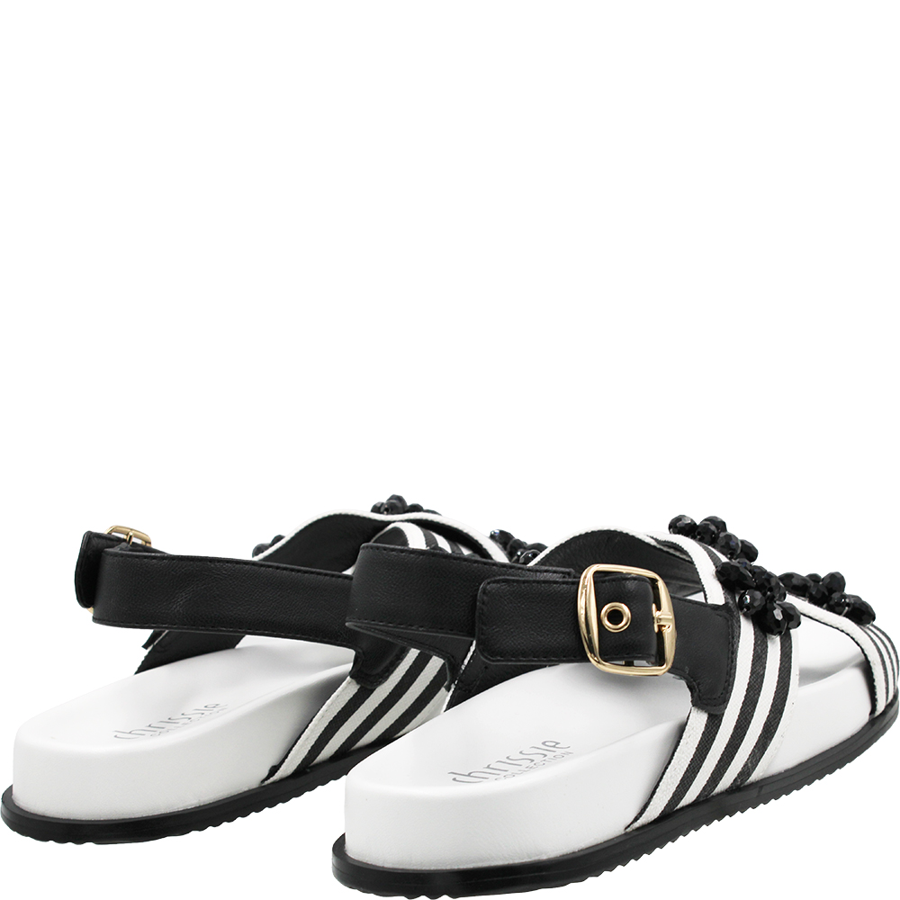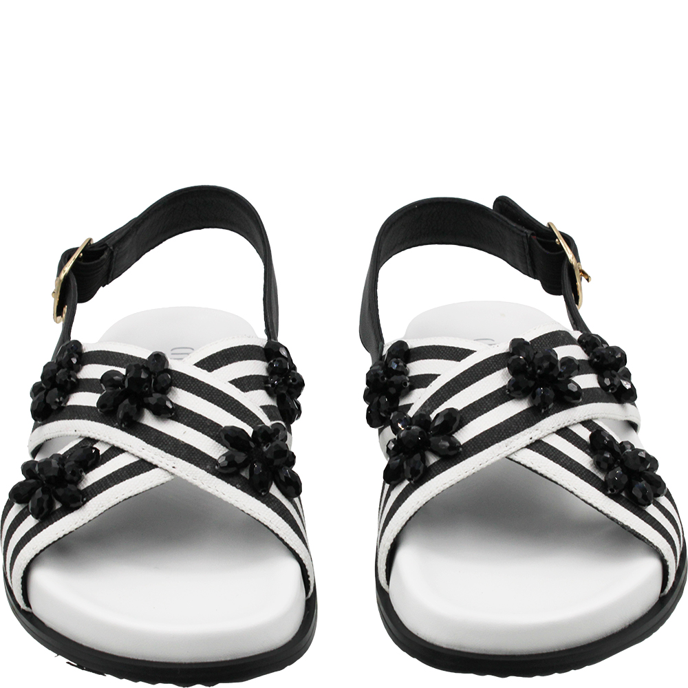 Chrissie Summer Black White Stripe Sandals. The thick supple bands of leather hold the foot in place and are covered in a bold striped linen textile for interest AND adorned with beads in a scattered floral motif. With comfort and even a dose of arch support, these crossover sandals will delight your feet. The padded and sculpted footbed ensures all day comfort while the slingback strap adjusts for the perfect fit with a gold-toned buckle.