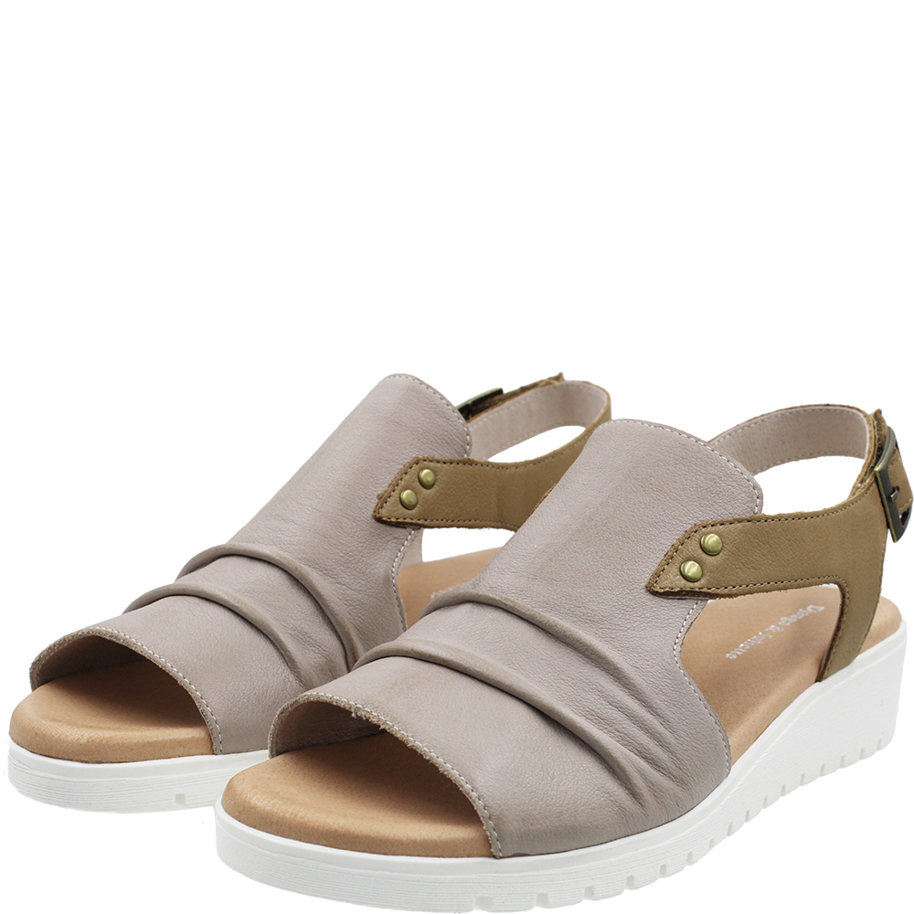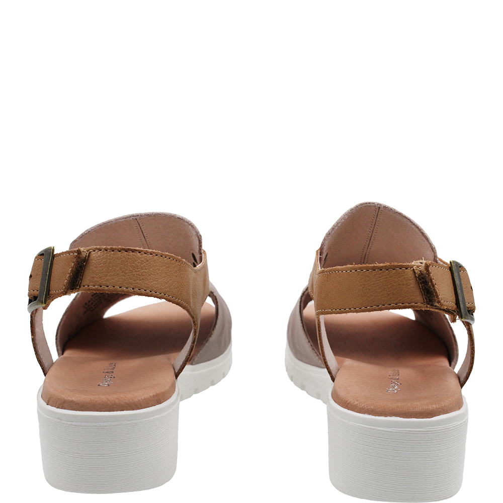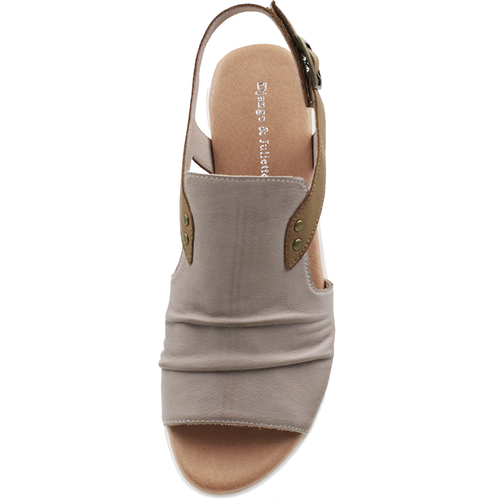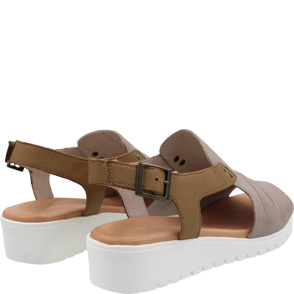 Django & Juliette Madis Cafe Dark Tan Leather Sandals on a wedge, combines invisible comfort with contemporary elegance. On a flexible wedge sole topped with a padded footbed, you get comfort and stability. Bunions are well accommodated in the forepart as there is enough leather to hide them, yet with side and heel cutouts, it also breathes. The rear strap is on velcro for ease of getting on and off, and there is a buckle for even more flexible adjustment. Designed in Australia.
