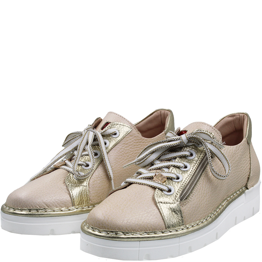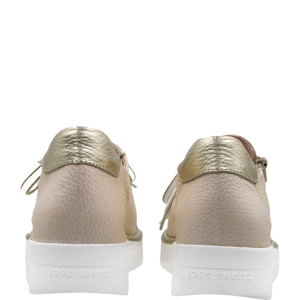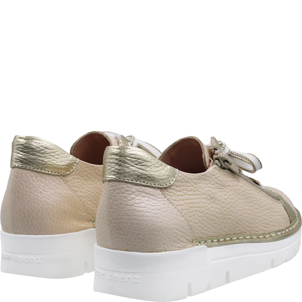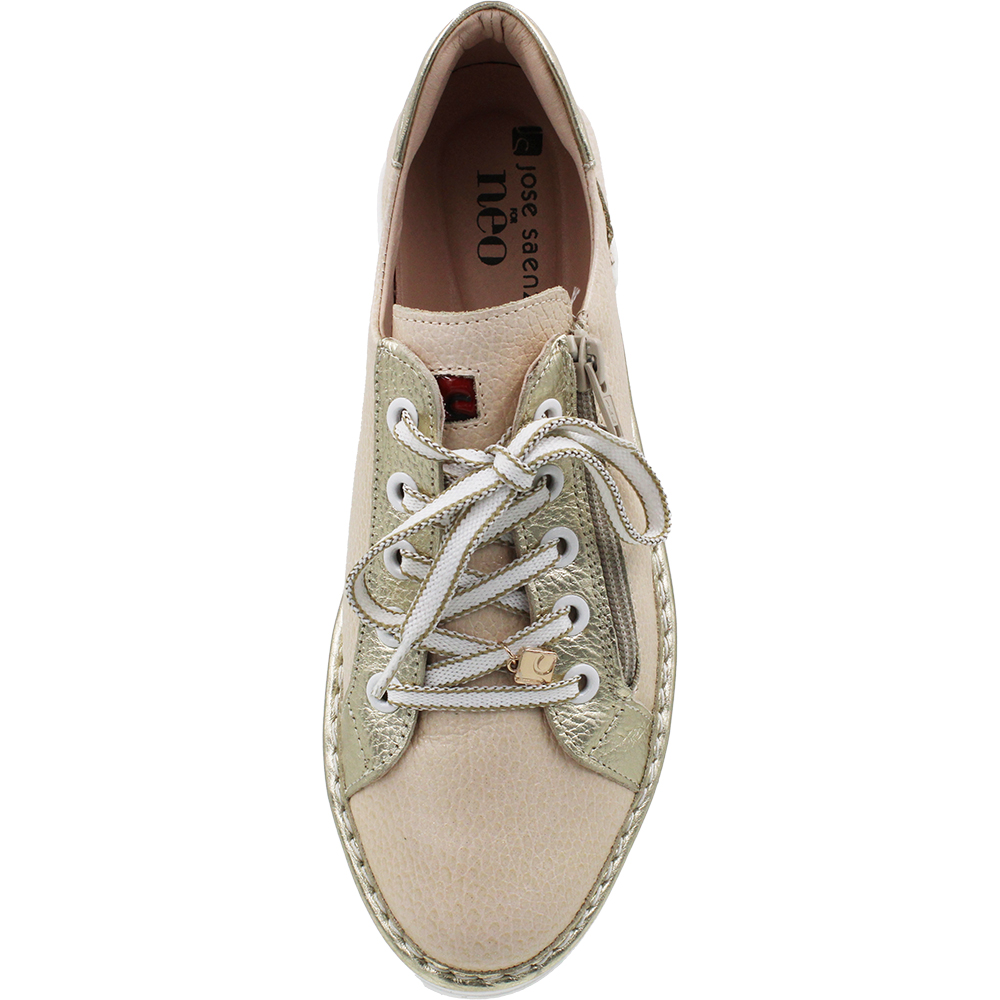 Jose Saenz for Neo Champagne Gold Leather Sneakers 2001 are lightweight and very comfortable. The sculpted footbed is soft, supportive, but above all removable! So this is also an orthotic taking sneaker (Shhh… we won’t tell). Slip in, cinch those laces for the perfect fit then just use the zip to get in and out in a flash. Seriously all day comfortable. The textured nude coloured upper has a subtle pale gold glitter effect for a hint of extra shine and works gorgeously with that metallic gold trimming. Amazing! Crafted in Spain.
