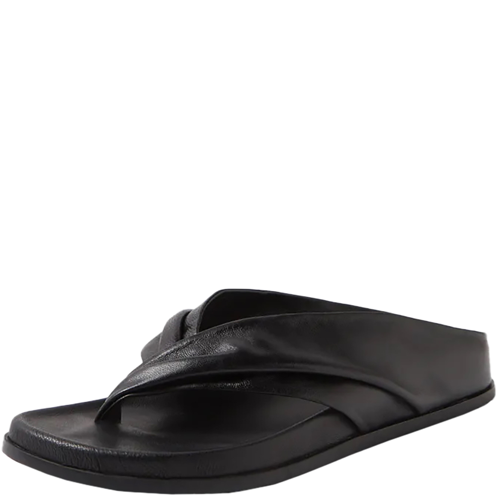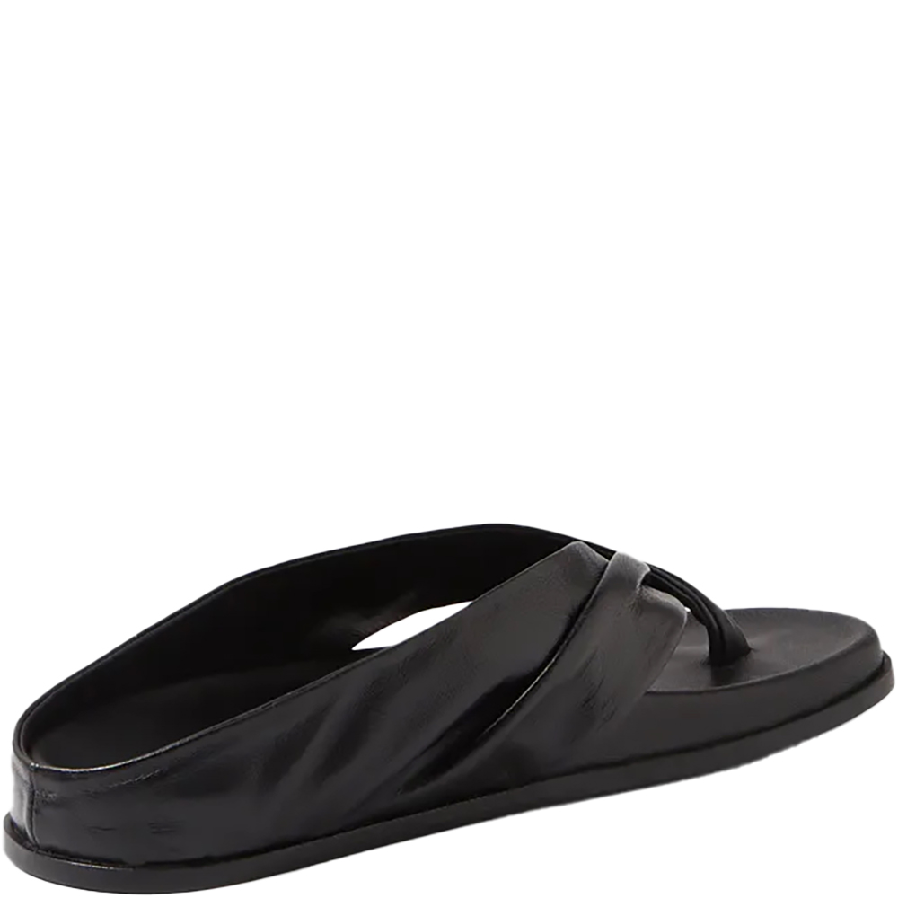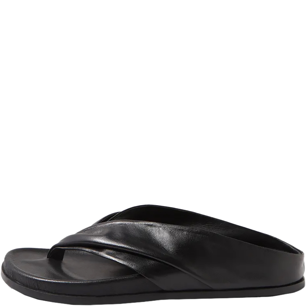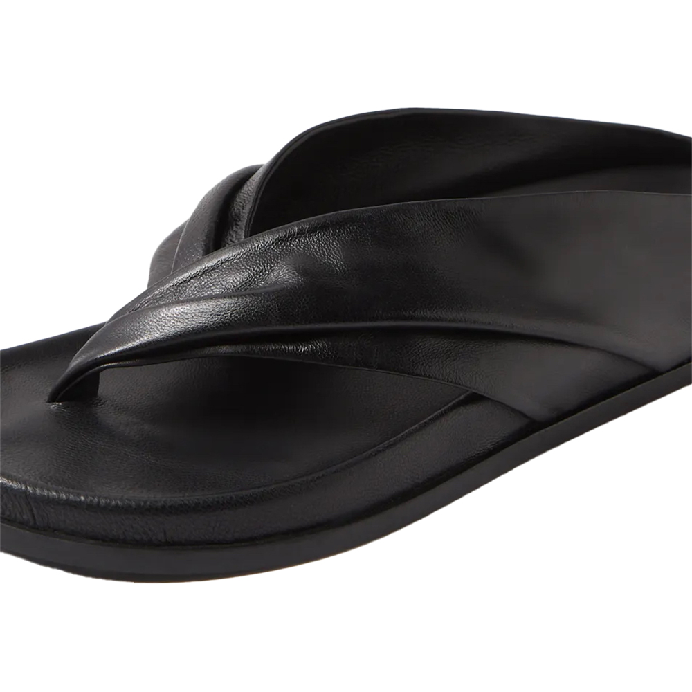 Mollini Hedley Black Thong Slides. With comfort and arch support in abundance, these leather thongs are a more refined take on a summer essential. Mollini’s Hedley wraps the foot in ruched straps, giving your sunny day styling an effortless, elegant twist. Designed in Australia.
