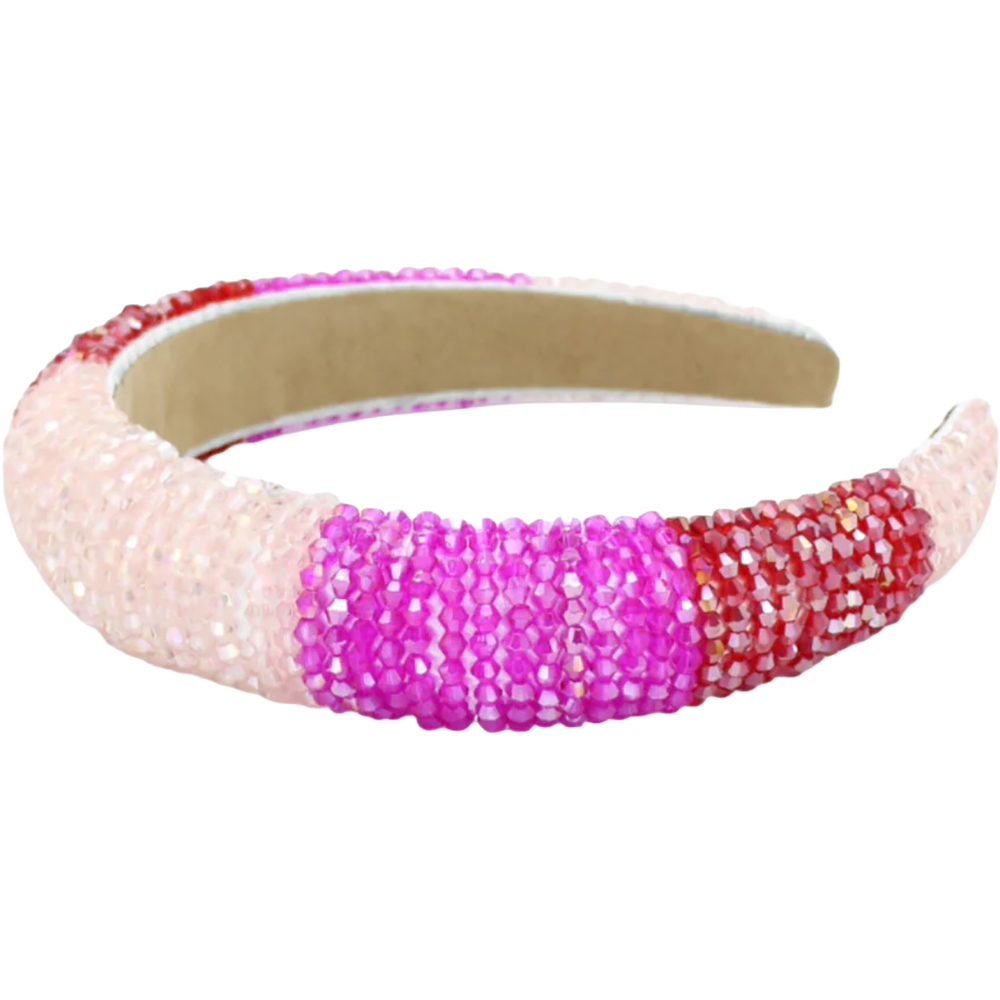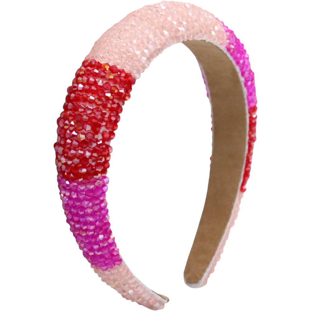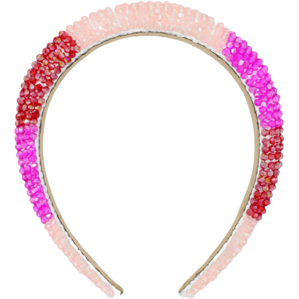 Fresh and modern, Morgan & Taylor’s Ada Hot Pink Headband has striking good looks, thanks to bands of light peach, hot fuchsia pink, and red faceted glass beads. With padding underneath the beading for extra height, and a soft fabric lined headband for all day wear, this is a go-to headpiece for all day. Or night.