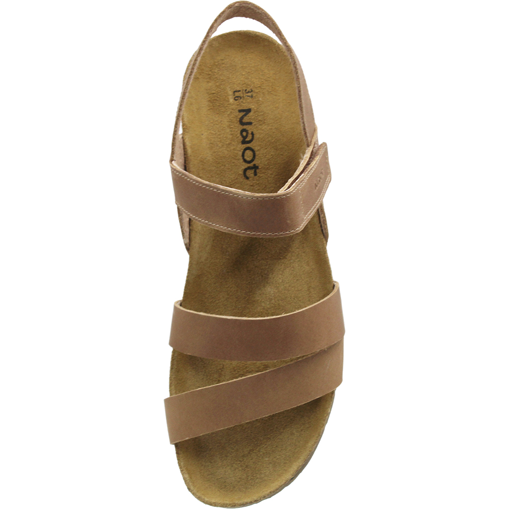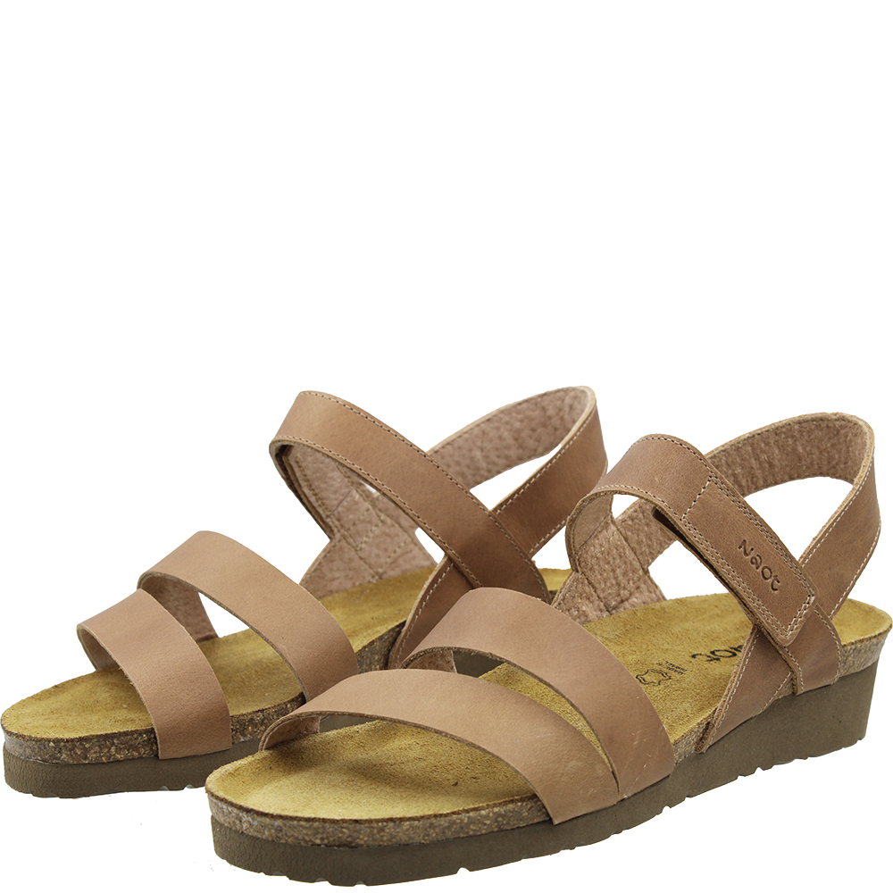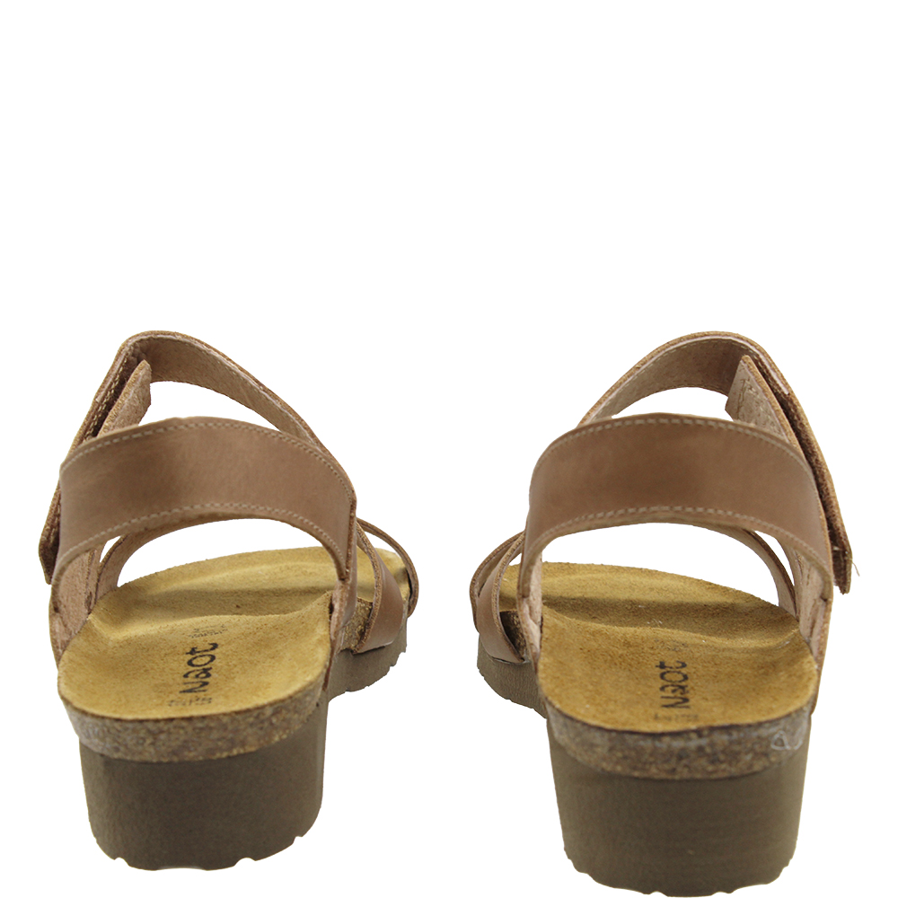 Naot Kayla Latte Leather Wedge Sandals are a neutral coloured everyday sandal with a three modern strap design. Over the arch the strap is adjustable thanks to the velcro, and underfoot you are walking on Naot’s iconic and superior anatomically-correct cork and latex footbed, wrapped in soft suede which moulds to the foot with wear. Part of the Elegant Collection, you will also love the lightweight EVA sole for added shock absorption and durability. This “latte” works as a tan in the wardrobe.