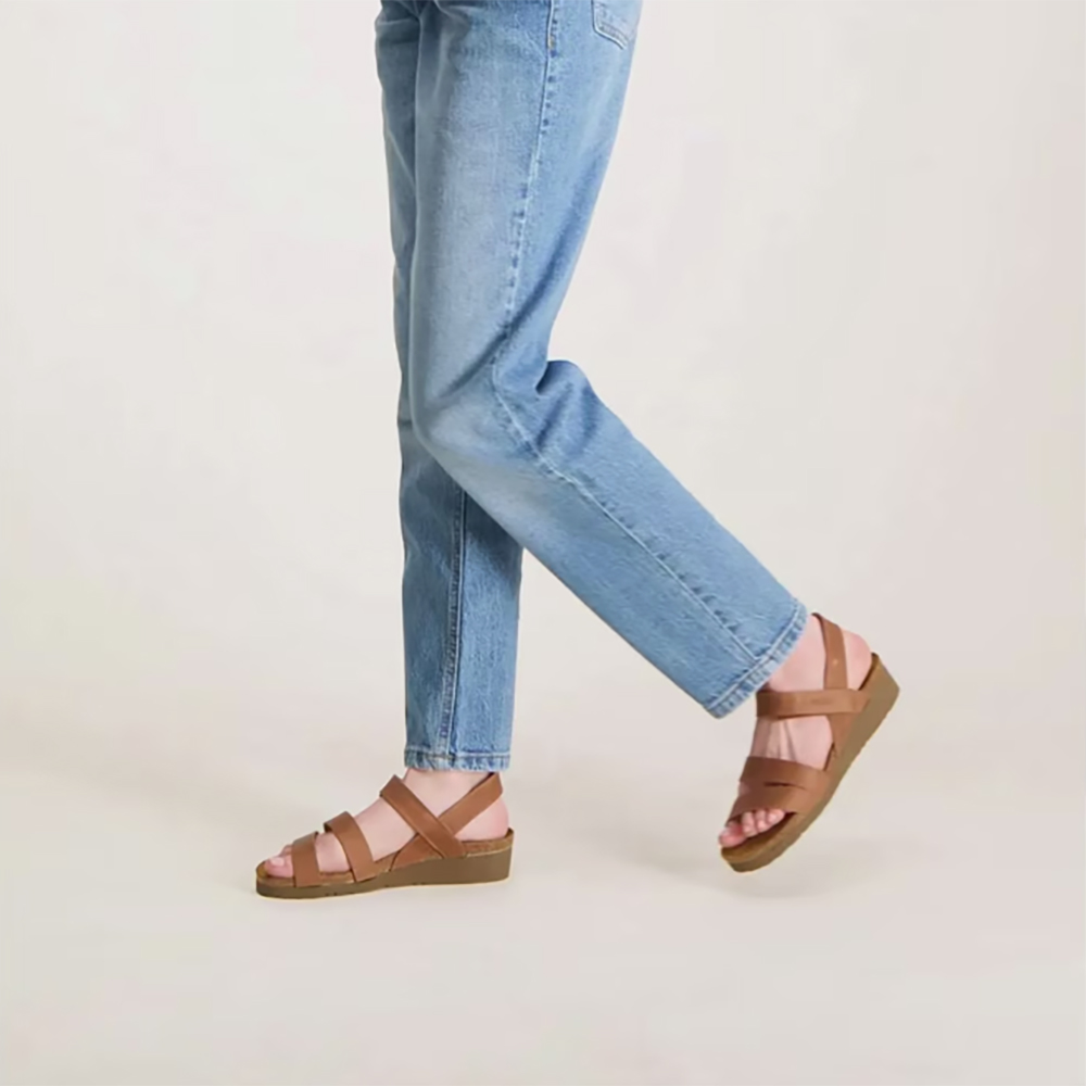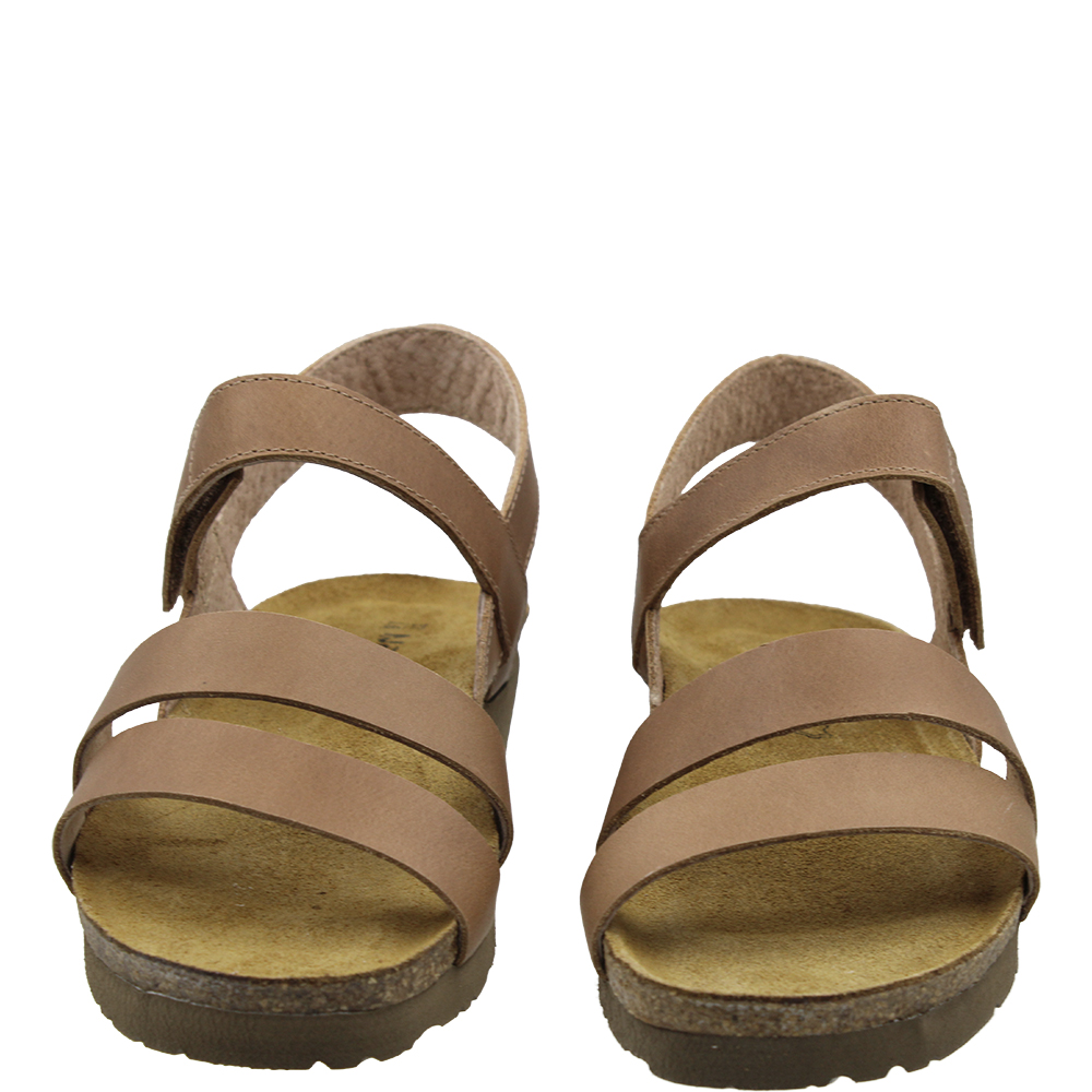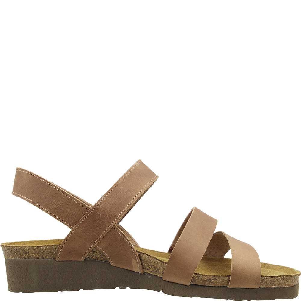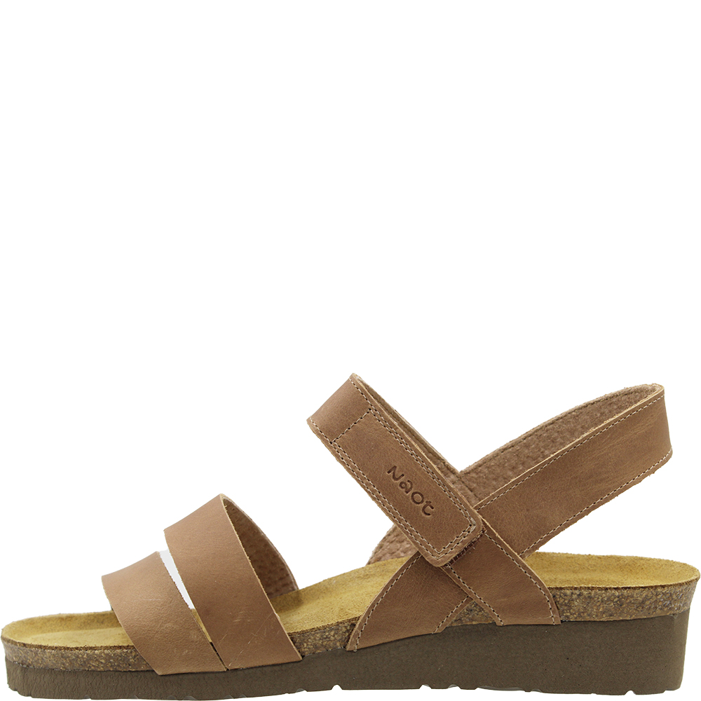 Naot Kayla Latte Leather Wedge Sandals are a neutral coloured everyday sandal with a three modern strap design. Over the arch the strap is adjustable thanks to the velcro, and underfoot you are walking on Naot’s iconic and superior anatomically-correct cork and latex footbed, wrapped in soft suede which moulds to the foot with wear. Part of the Elegant Collection, you will also love the lightweight EVA sole for added shock absorption and durability. This “latte” works as a tan in the wardrobe.