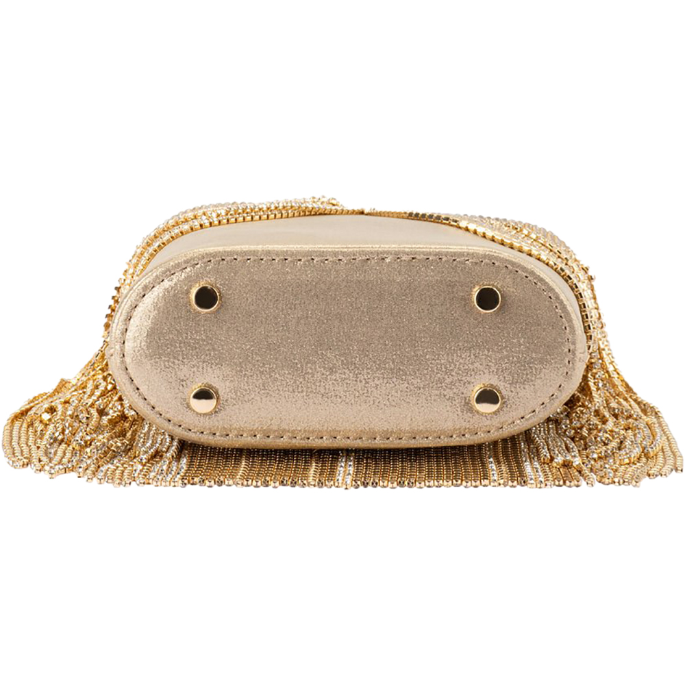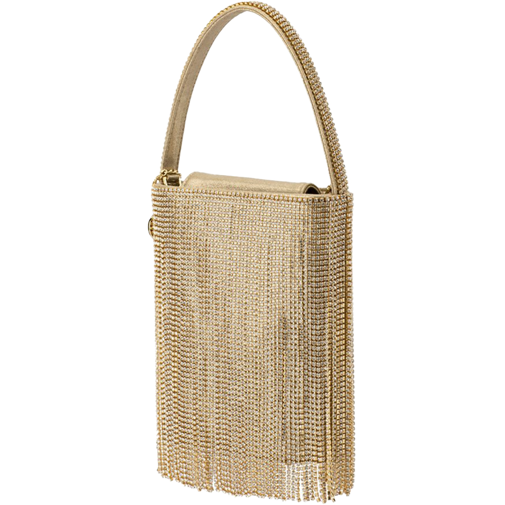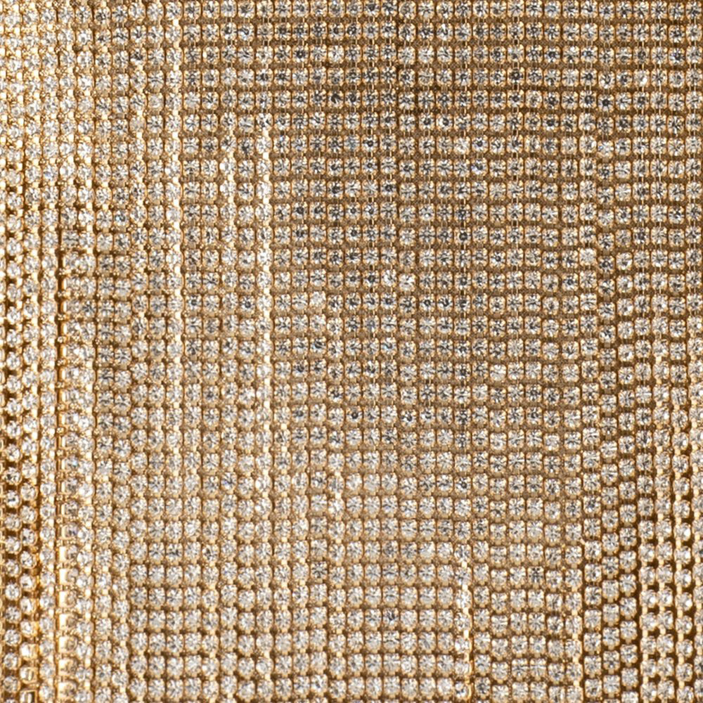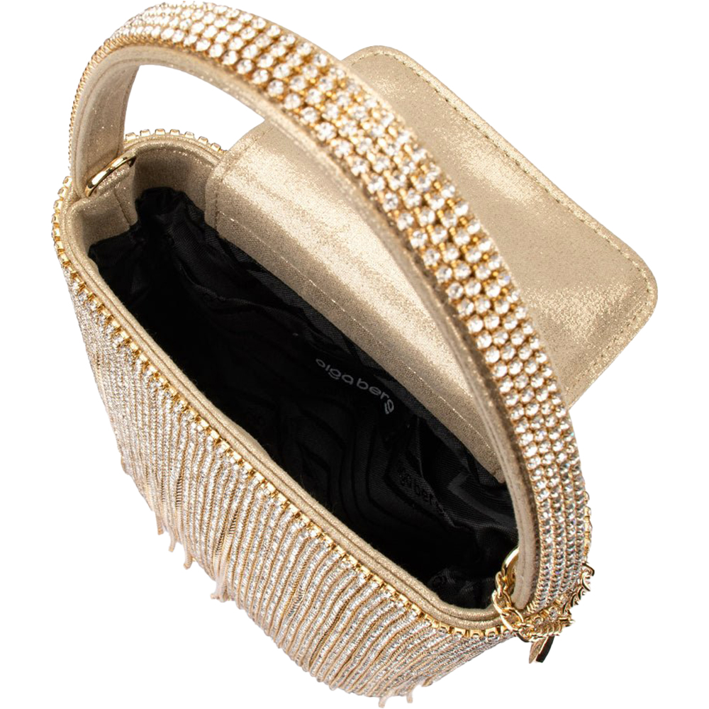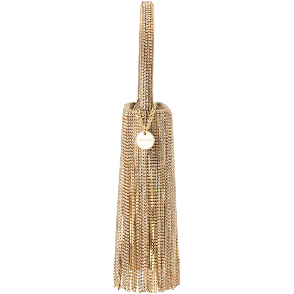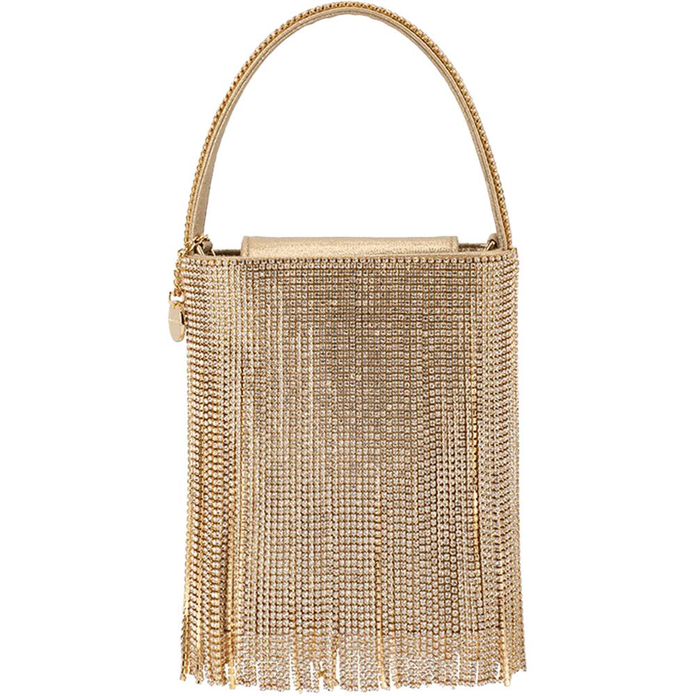The stunning Olga Berg Billie Champagne Crystal Fringe Bag should boast – she is dramatic yet still wildly practical. This dazzling and spacious evening bag is glamorous, with a swinging fine, crystal embellished top handle, and a north south design that allows for your mobile phone and goodies to just slip in. Includes a long detachable gold chain should you need it to slip over your shoulder. Designed in Melbourne.