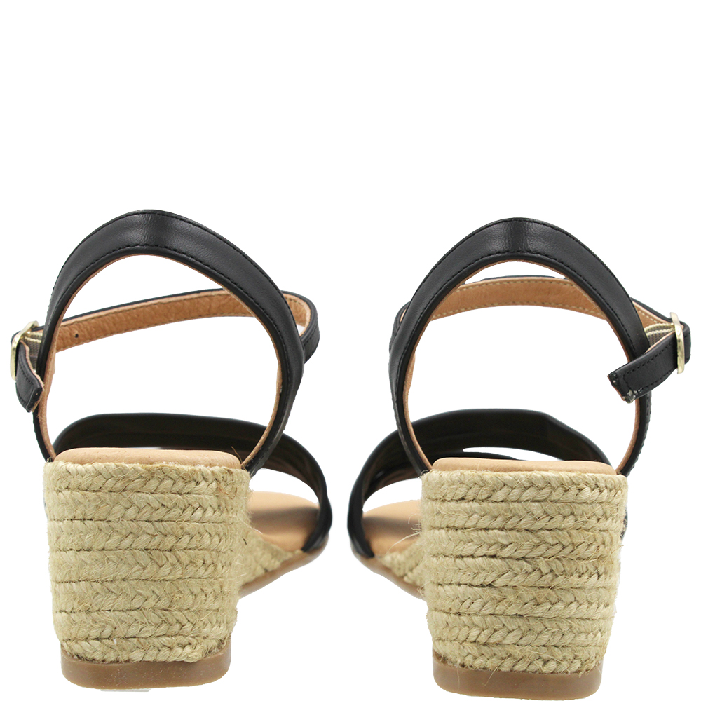 Pinaz Black Leather Espadrille Wedges 518/5 feature two asymmetrical tubular bands of supple leather which hold the toes and forefoot in check, while the the slim ankle strap supports you in back. Nicely pitched and beautifully padded underfoot. The mid height wedge sole is wrapped with natural jute using traditional techniques. So summer, so stylish, so Pinaz. Handcrafted in Spain.