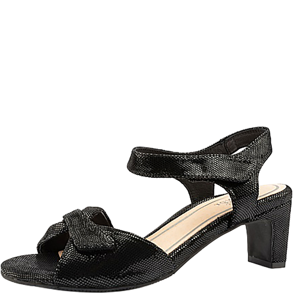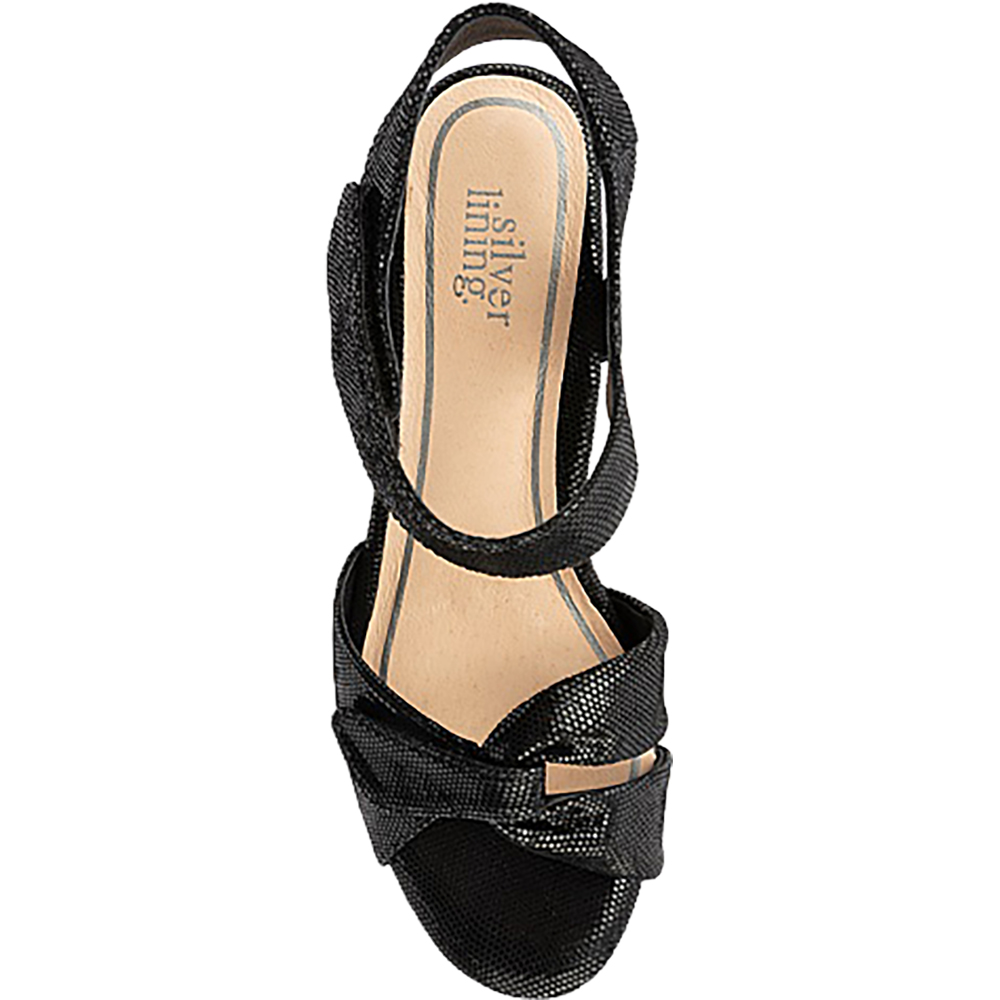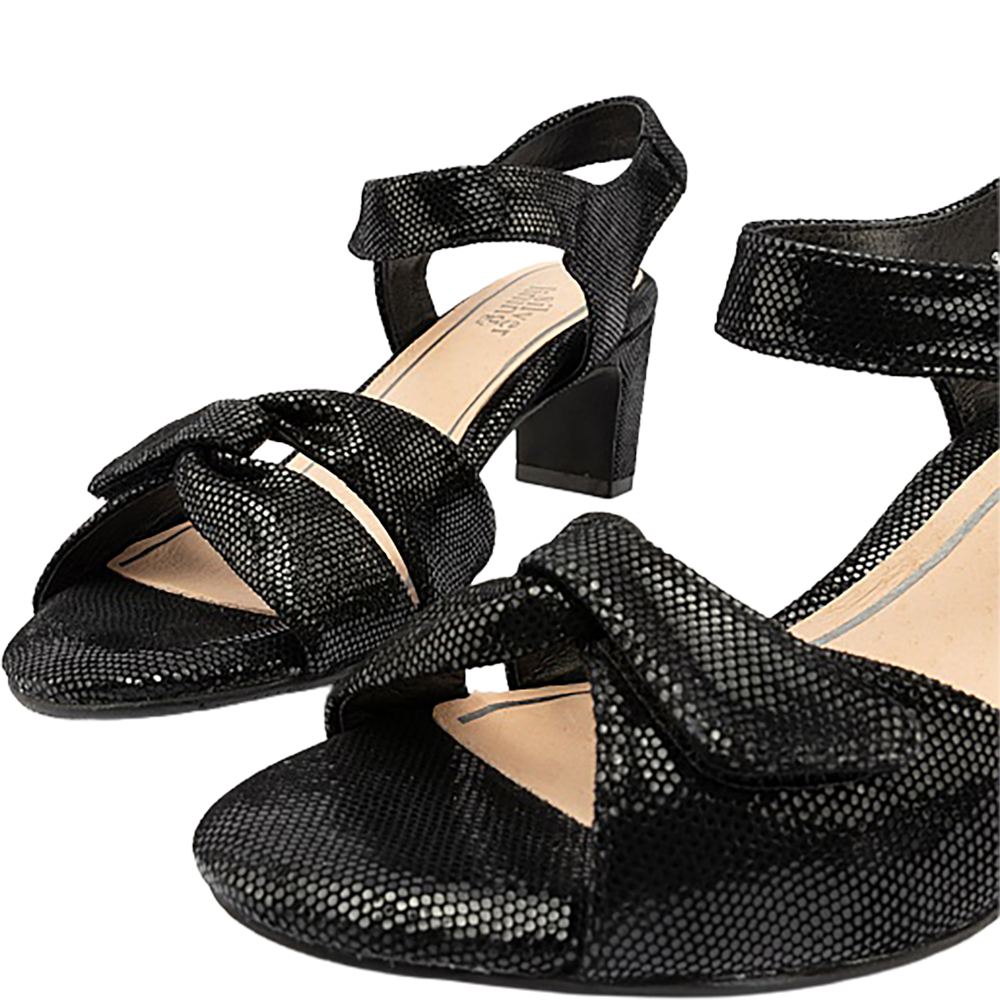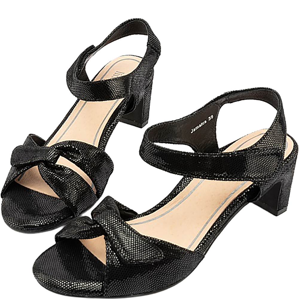 Silver Lining Jamaica Black Sparkle Sandals are a wonderful and flattering mid heel day-dress sandal. The shimmery embossed leather adds luxe and interest. Then there’s that incredible padding underfoot, and there are two velcro adjustable straps – one over the toes, the other around the ankle for a secure, comfortable, flexible fit for different foot types. The heel is outdoor event and grass friendly and these open toe sandals tick all the style AND comfort boxes. Designed in Australia.